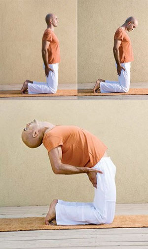 – Затем следует наклонить голову вперед, прижав подбородок к грудине. Забрасывая голову назад‑вверх, выпячиваем грудную клетку и прогибаем позвоночник назад, немного опираясь руками о бедра, после чего возвращаемся в исходное положение с прижатым к грудине подбородком. Немного отдохнув, если необходимо, повторяем все сначала.