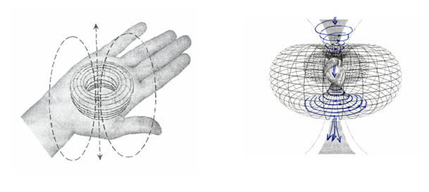 Тороидальная форма электромагнитного поля, является основной характеристикой полей, которые генерируются сердцем и ладонью человека. Такая форма поля является основным фактором, влияющим на характер спиралевидного вращающегося вихря, который захватывает или испускает различные энергии и свет. Вероятно есть взаимосвязь с спиралевидным полем руки и спиралевидной энергией кристаллической решетки (оболочки памяти) Кода Жизни (ДНК) клетки тела человека.