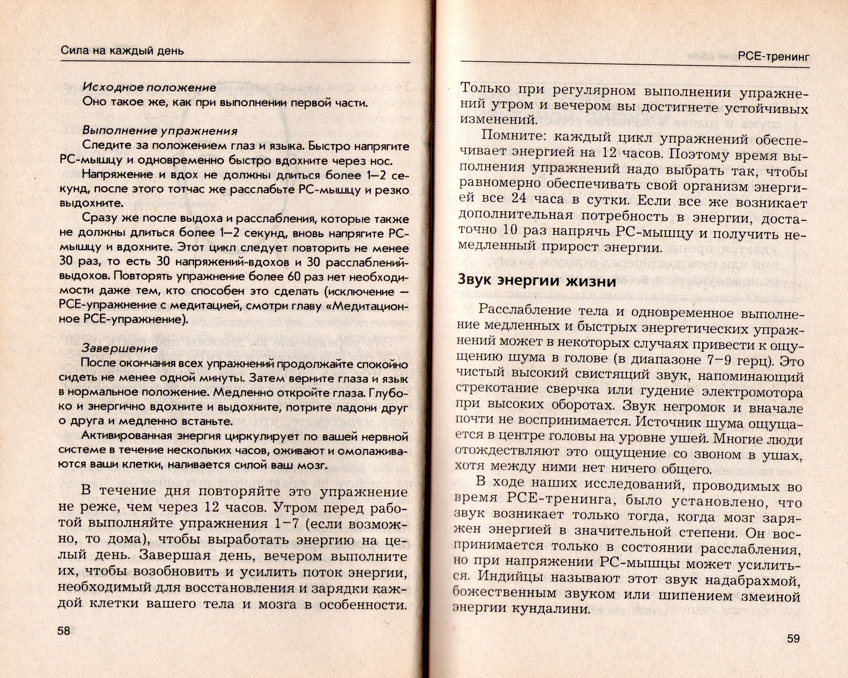 Мы видели, что сексуальность, или, другими словами, сексуальная (жизненная) энергия, является той силой, которая во многом определяет нашу жизнь. PC-мышца как один из наиболее действенных источников энергии человеческого тела принимает участие в самом возвышенном творческом акте, к которому способен человек. Энергия, рождающая жизнь, является в то же время энергией, поддерживающей жизнь. Использовать эту энергию помогает РСЕ-тренинг.