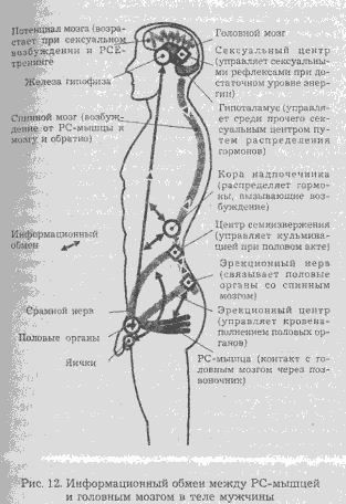 PC-мышца связана с тазовым внутренним нервом. От него ведет ответвление, которое у женщин соединяет нижнюю часть позвоночника с маткой и мочевым пузырем, а у мужчин – с простатой и мочевым пузырем. Если РС-мышца сильна, она является колоссальным источником энергии, подлинным генератором. Сокращения PC-мышцы стимулируют также простату у мужчин и матку у женщин. При этом вырабатываются гормоны, вызывающие приподнятое настроение, ощущение счастья. PC-мышцу можно, как практически все мышцы тела, укрепить определенными упражнениями.