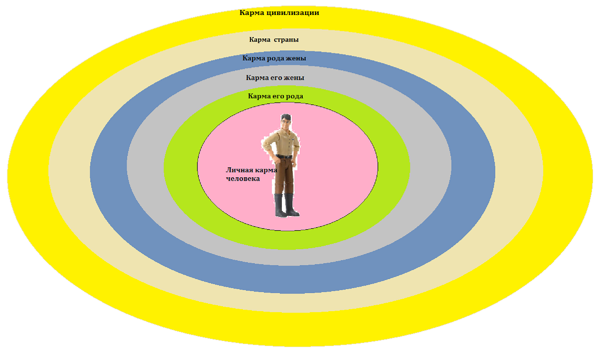 Чтобы было проще передать смысл, условно можно разделить влияние кармы на несколько уровней, по силе влияния на судьбу человека. А судьба –это здоровье, это радость, благосостояние, социальный слой, в котором нам уготовано жить, а так же люди, нас окружающие, их поведение и многое другое. Самое сильное влияние на взрослого человека оказывает его личная карма, второе — карма его рода, далее — карма жены — её рода, карма страны, карма цивилизации, карма планеты.