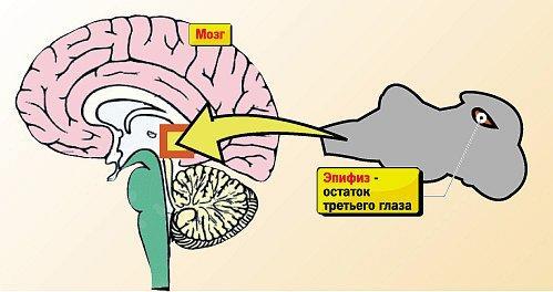 — Действительно, как показали последние медицинские исследования, третий глаз был и у человека, — соглашается кандидат медицинских наук, сотрудник офтальмологического НИЦ Валерий ГРИГОРЬЕВ. — Да он и сейчас есть. Его «закладка» вместе с хрусталиком, фоторецепторами и нервными клетками образуется в районе промежуточного мозга у двухмесячного плода. Но потом перестает развиваться. И превращается в эпифиз или шишковидную железу — крохотное, весом меньше полуграмма, зернышко красно-бурого цвета, запрятанное в самую глубину головного мозга. Эта железа удивительно подвижна. Она способна вращаться подобно глазу и улавливать свет.