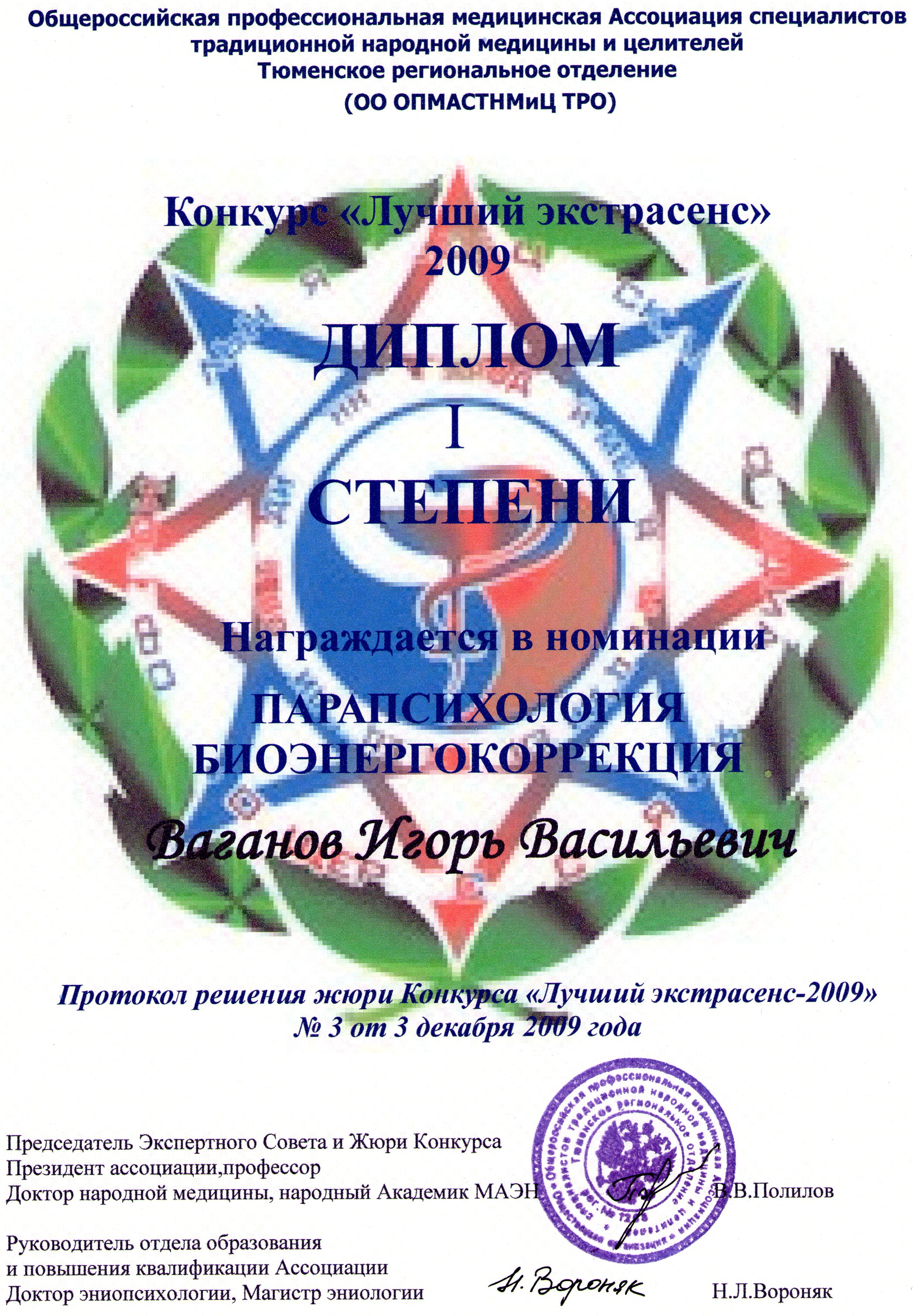 - Лауреат конкурса лучший экстрасенс 2009 года, проходившего в Тюмени. Диплом первой степени в номинации парапсихология биоэнергокоррекция.