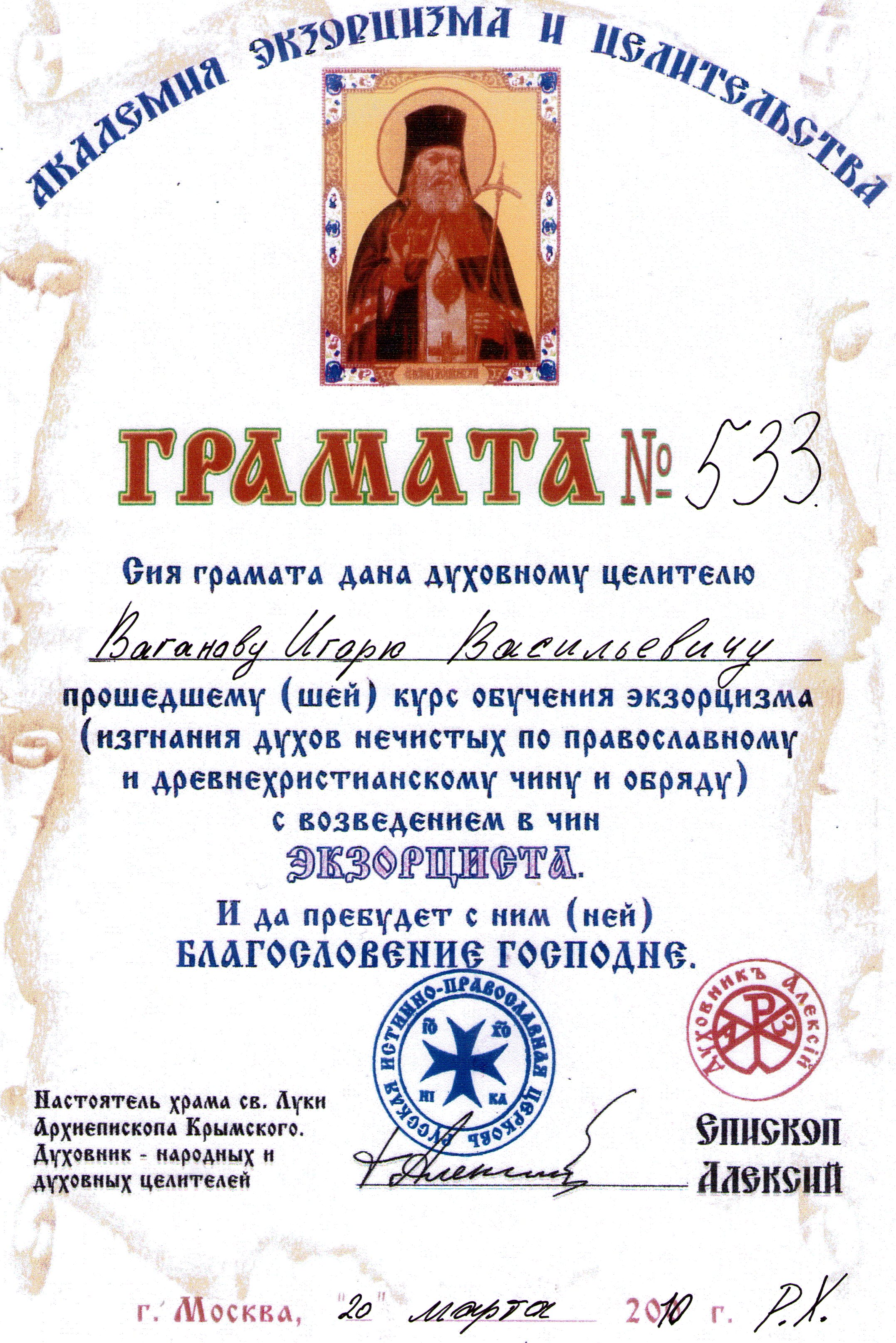 Следующий шаг был неожиданностью для меня самого, я получил чин экзорциста от отца Алексия, он приезжал в Тюмень буквально на сутки. Удалось встретиться с ним. При обучении обряду, происходит сонастройка с энергиями эгрегора христианской церкви.