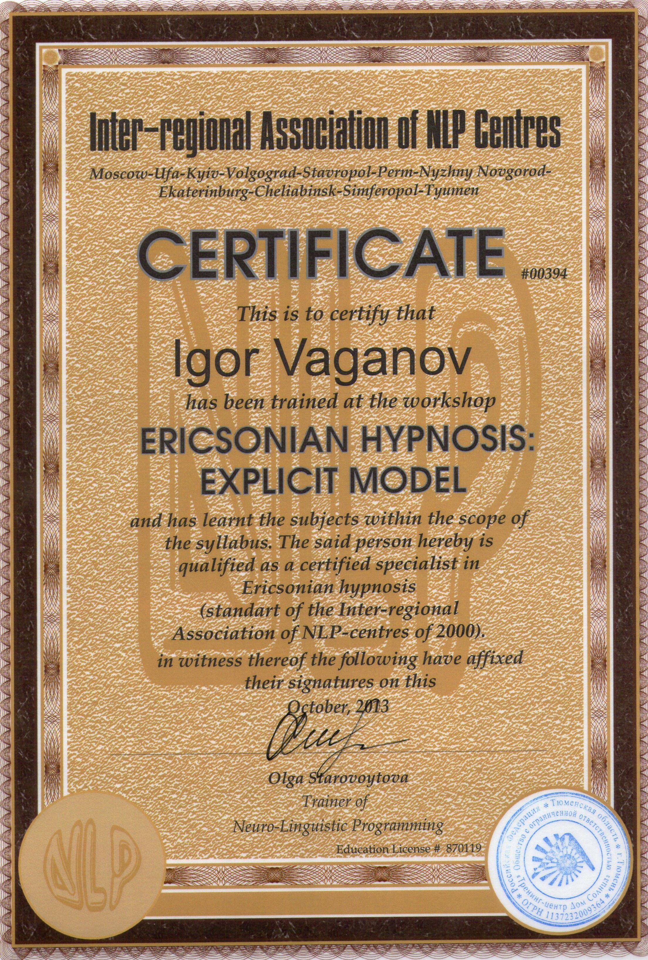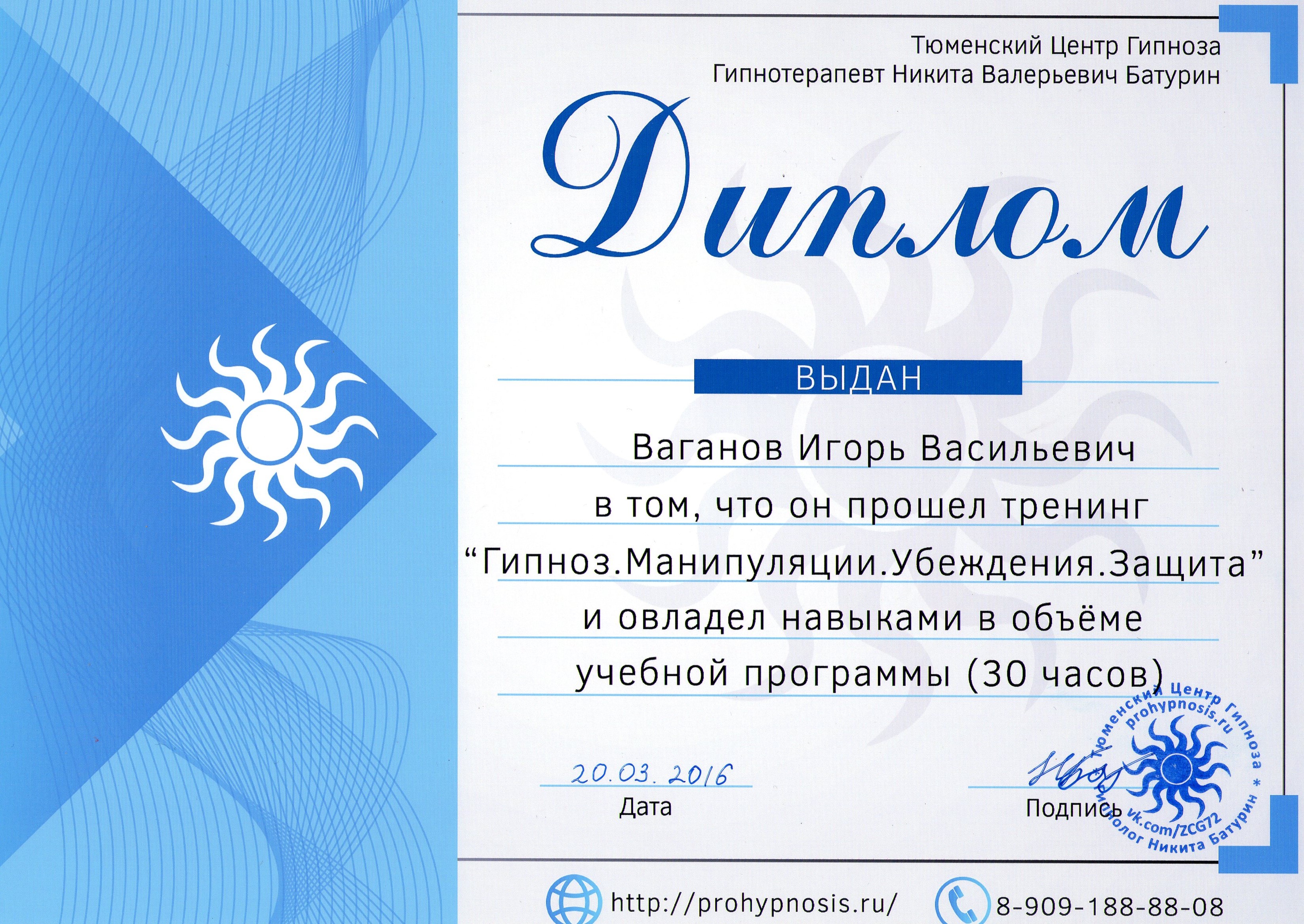 Для того что бы лучше понимать процессы протекающие в подсознании, прошёл обучение Эриксоновскому гипнозу. Но на Эриксоновском гипнозе обучение в этом направлении не остановилось, я прошёл обучение классическому гипнозу.