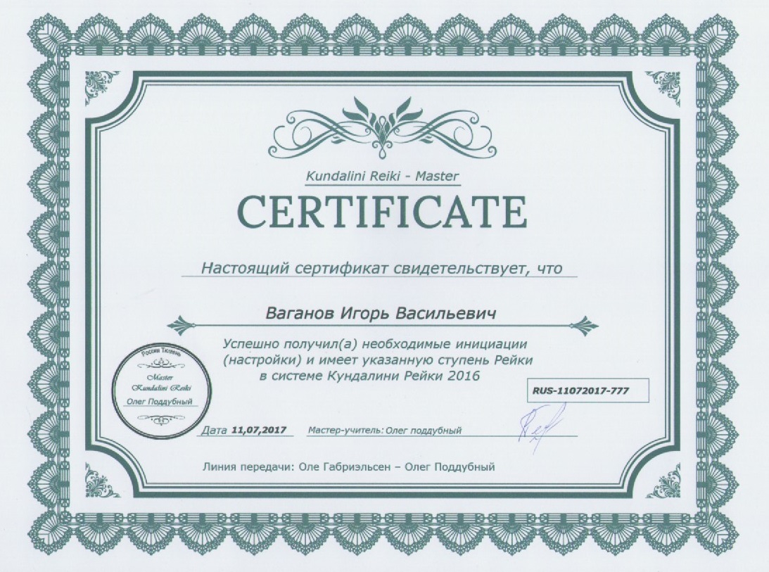 Получил мастера Кундалини Рэйки, а так же инициацию в Рэйки Игдрасиль