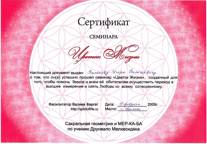 Медитации Мер-Ка-Ба обучают на 3-4х дневных семинарах, и по окончании выдаётся вот такой сертификат.