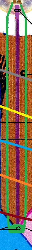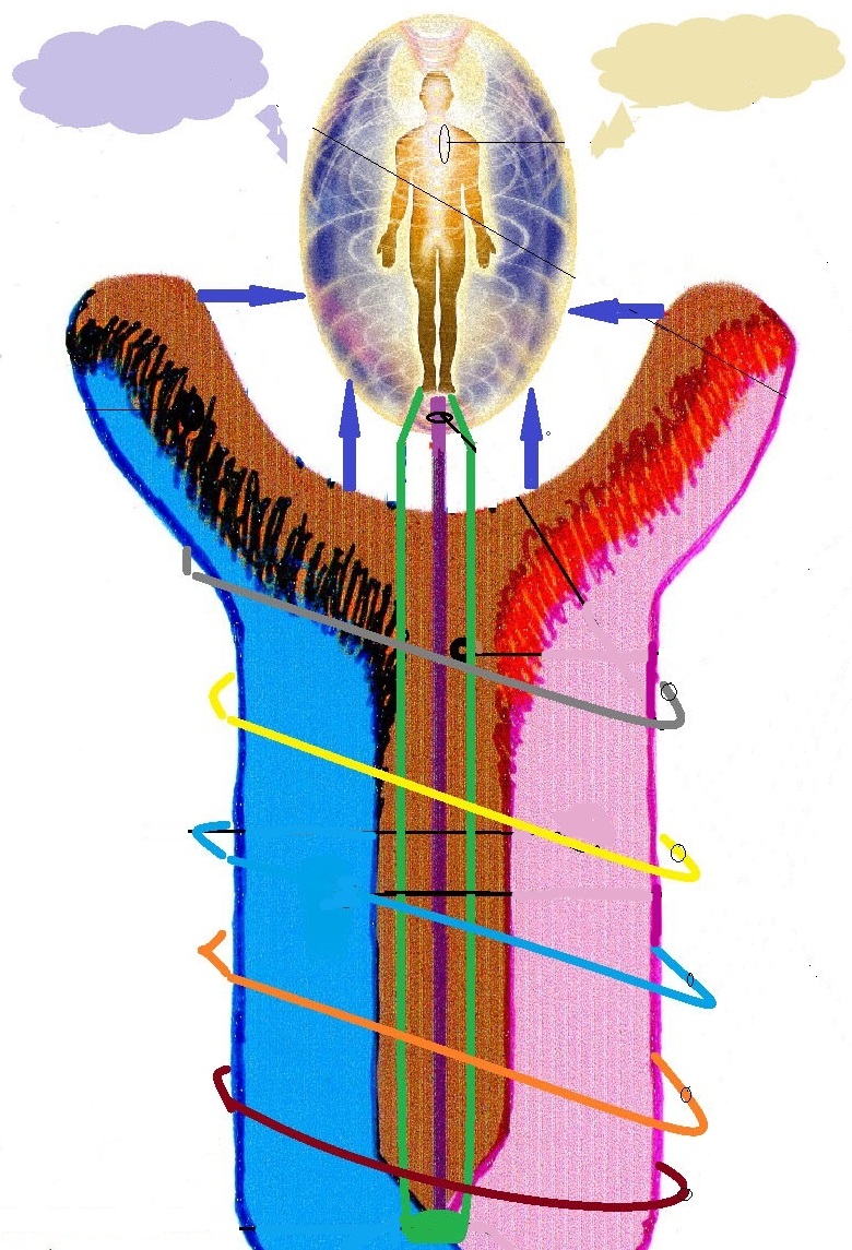 Глядя на эту часть рисунка пронизывающего всю конструкцию, нужно понимать, что в этой тонкой фиолетовой линии заключён опыт каждого предыдущего воплощения, со всеми механизмами и переплетениями родовых влияний и, конечно же, всех эгрегоров, повлиявших на жизнь прошлых воплощений. А также весь жизненный опыт прожитых жизней.