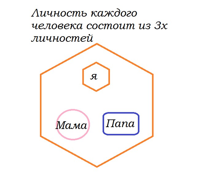 По мере взросления ребёнка (а мы все ими были), начинает формироваться его собственная личность. (На рисунках она обозначена оранжевым шестиугольником). В разные периоды жизни ребёнка, а также в силу различных обстоятельств на формирование личности в разной степени влияет мамин или папин энергоинформационный компот, наполняя личность ребёнка состояниями, присущими маме или папе.