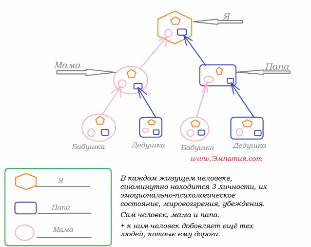 Я взял только три колена рода, а на самом деле это течёт из далекого прошлого, но чем дальше от вас предок, тем слабее его влияние, передаваемое по родовой линии.