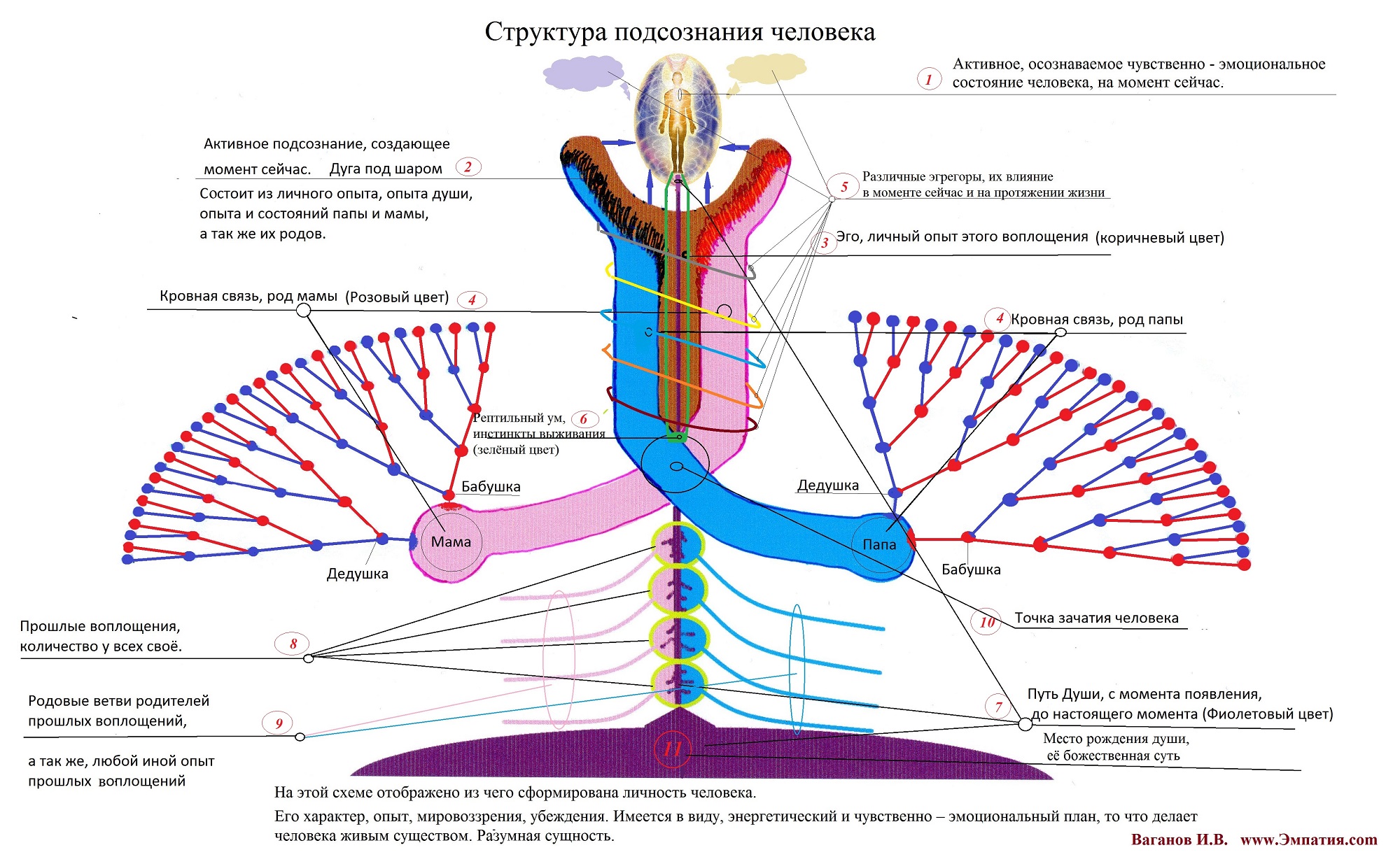 Вот так я чувствую все механизмы взаимодействия уровней подсознания. Конечно, эта картина целиком не видна, когда смотришь на человека своим сознанием, её можно изучать отдельными частями, как бы присматриваясь то одному участку схемы, то к другому.