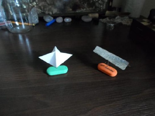 Итак, вам понадобится обычная иголка или зубочистка или игла от шприца. Второе — небольшой прямоугольной формы кусок бумаги, фольги или просто купюра любого номинала. Согните её, как на фото. Два варианта. В принципе, можно любой формы. Главное, чтобы она свободно могла вращаться на иголке.