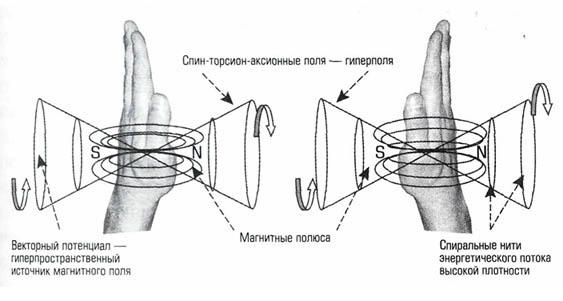 Тороидальная форма электромагнитного поля, является основной характеристикой полей, которые генерируются сердцем и ладонью человека. Такая форма поля является основным фактором, влияющим на характер спиралевидного вращающегося вихря, который захватывает или испускает различные энергии и свет. Вероятно есть взаимосвязь с спиралевидным полем руки и спиралевидной энергией кристаллической решетки (оболочки памяти) Кода Жизни (ДНК) клетки тела человека.Торсионные_поля1